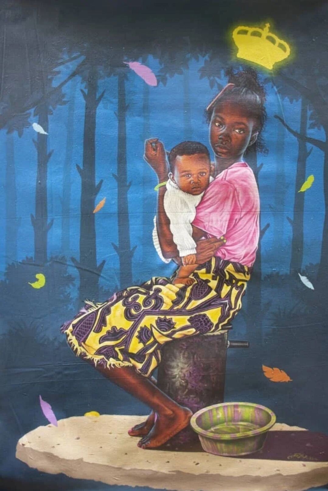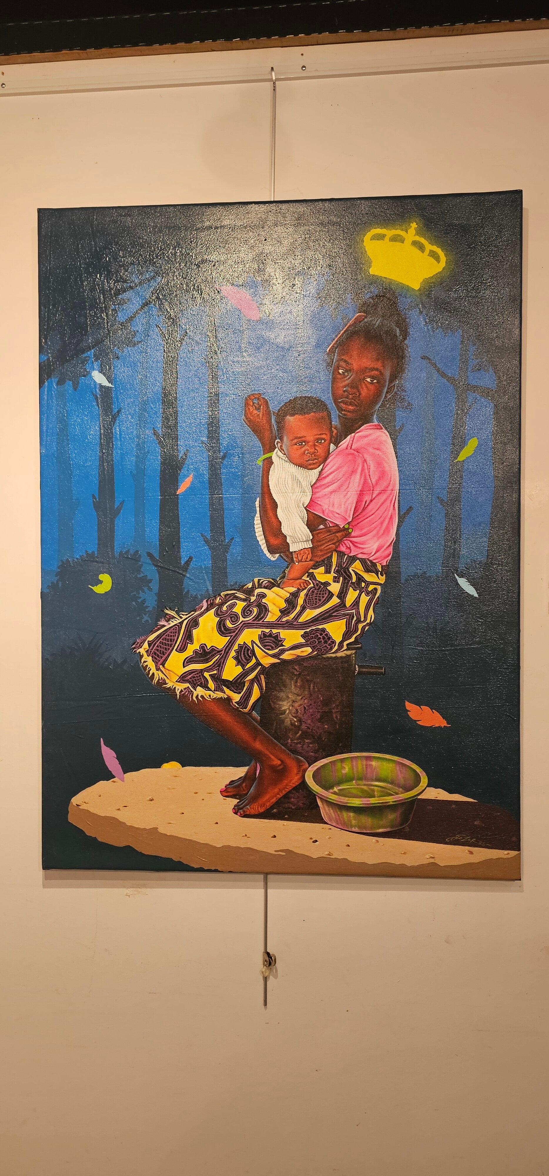 Seated on a mortar, holding a baby in her arms, this child is no longer allowed to dream. Yet above her head floats a crown — a symbol of dignity and inner strength.
