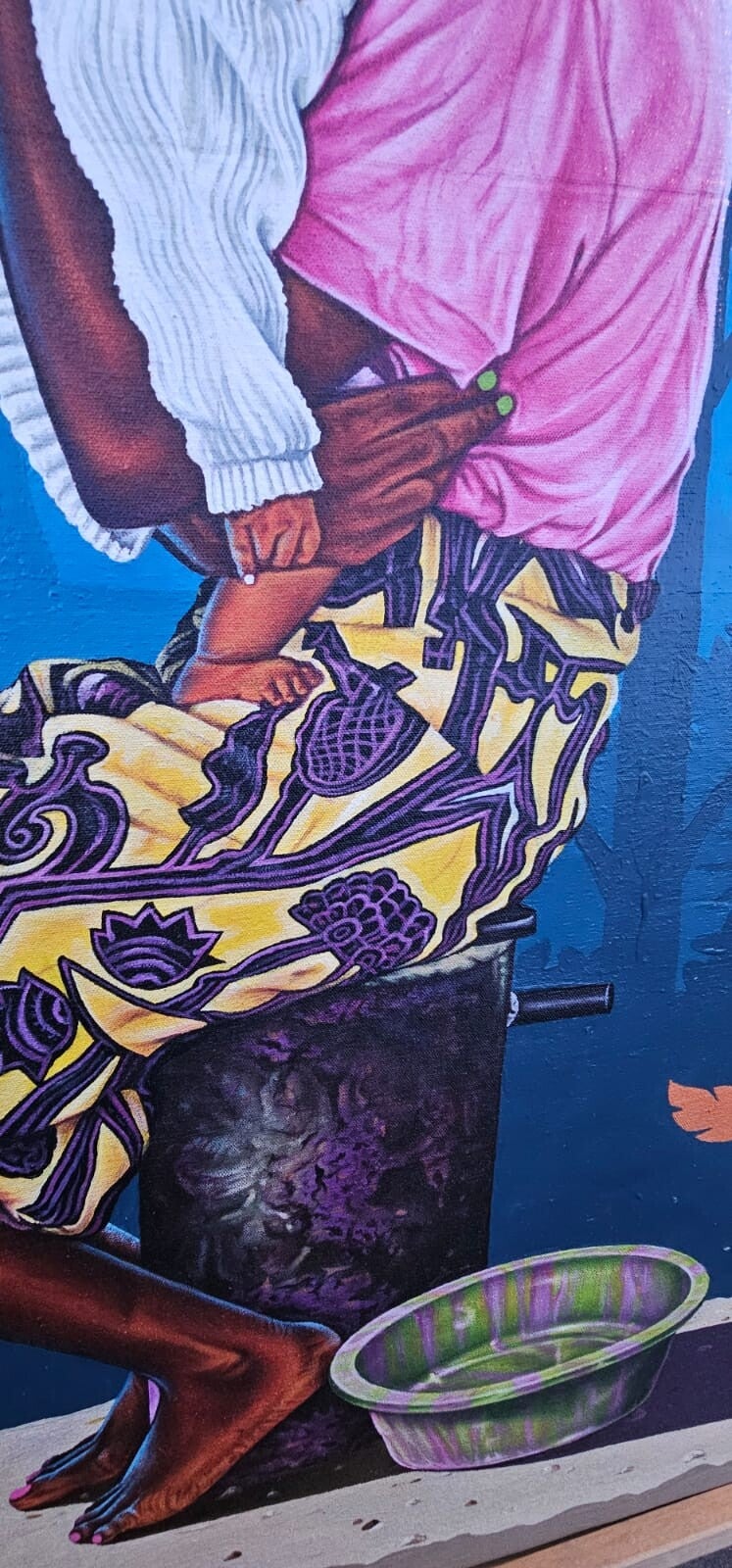 Dans un décor sombre et dense , une enfant tient un nourrisson dans ses bras. Elle est assise sur un mortier - symbole domestique lourd de sens - tandis qu'un bassin repose à ses pieds, soulignant a dureté de son quotidien. Son regard, grave, interpelle et transcende: il raconte une vie dérobée, des rêves interrompus.
