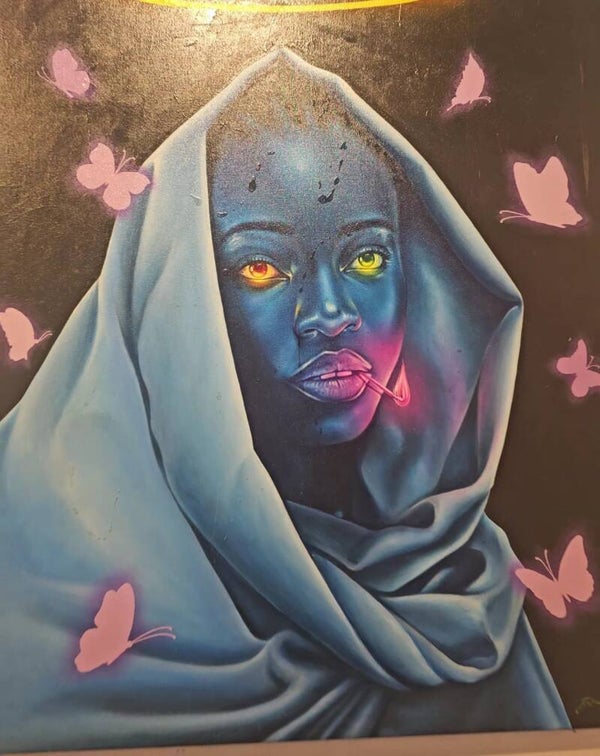 FR: Voilée de lumière, elle veille la nuit. Son regard mêle feu et douceur, tandis que les papillons naissent de sa flamme, de son souffle.
